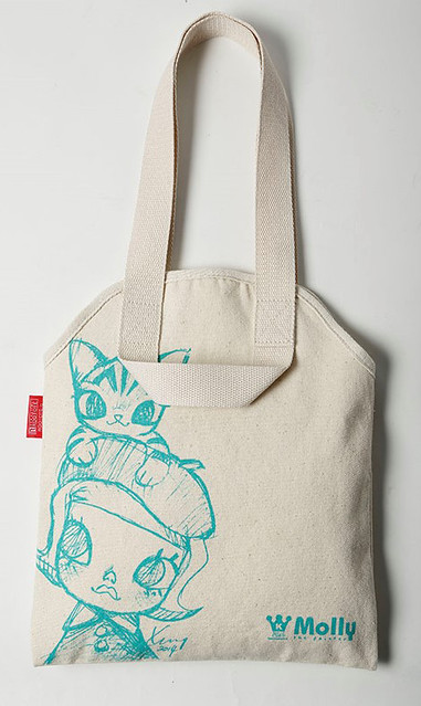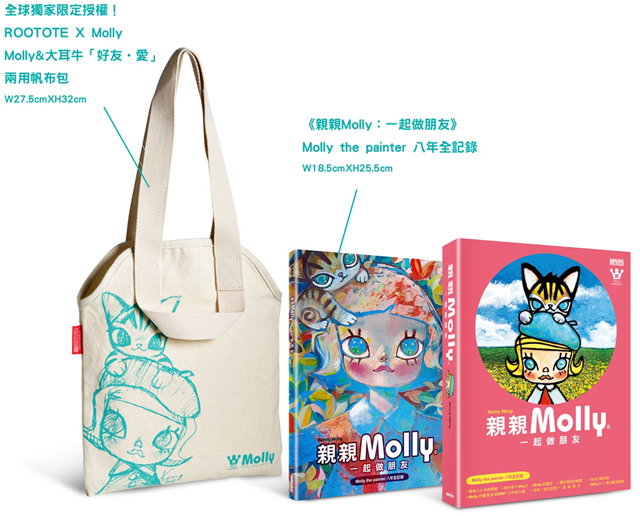 《親親Molly:一起做朋友》除了實體的書籍之外,還將附上一款【Molly‧大耳牛相親相愛】兩用帆布包,這是由日本知名品牌ROOTOTE 唯一授權合作的作品,採用10 盎司帆布製作,可側背/手提使用,也可藉由折疊變成手提包,可容納一般筆電、iPad 或A4 大小書本,可愛又實用!~