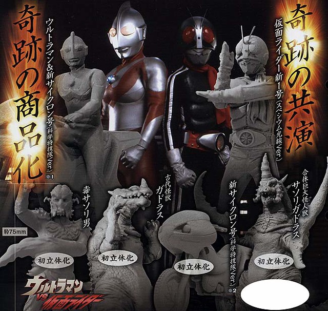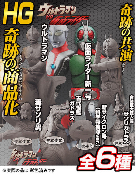 首次將反派立體化,包括了毒蠍男(毒サソリ男)、古代怪獸ガドラス、颶風號科學特搜隊版及合體巨大怪人獸サソリガドラス。另外最酷的就是擺出力霸王光線技架勢的假面騎士新一號,以及乘坐颶風號的超人力霸王,是不是超熱血超有趣呢?本企畫將於9月以轉蛋形式販售,每蛋300日圓,大家一起期待吧!!!!!
