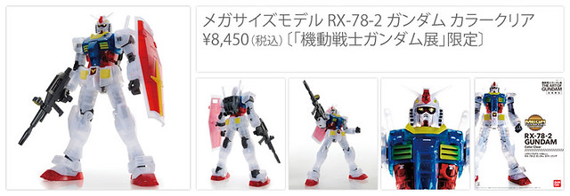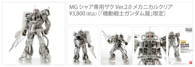 首先是《機動戰士鋼彈展》2014年大阪、2015年東京巡迴會場皆會有的限定版,一共有三款,分別為:MG RX-78-2 鋼彈Ver.3.0 機械透明版(MG RX-78-2ガンダムVer.3.0 メカニカルクリア)、MG 夏亞專用薩克Ver.2.0 機械透明版(MG シャア専用ザクVer.2.0 メカニカルクリア) 以及MEGASIZE RX-78-2 鋼彈 彩色透明版(メガサイズモデル RX-78-2ガンダム カラークリア)。