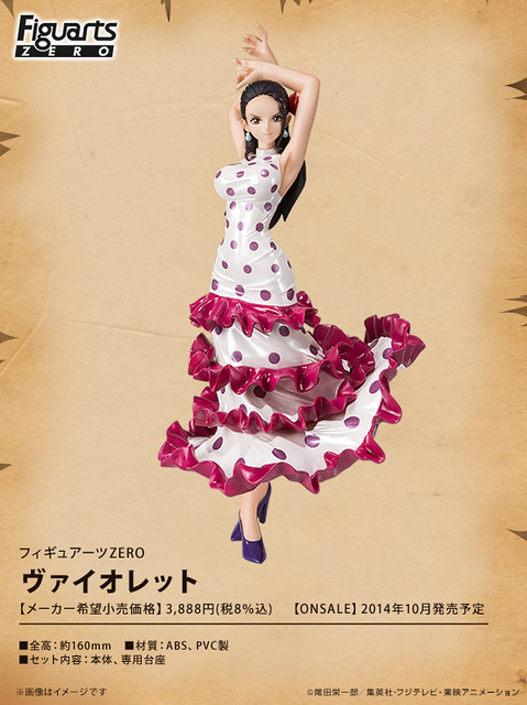 日BANDAI萬代玩具公司的Figuarts ZERO立體造型系列預計2014年10月推出『ONE PIECE』Violet 海賊王 紫羅蘭,在海賊王故事德蕾斯羅薩篇章登場的唐吉柯德家族的殺手紫羅蘭,表面上以舞孃身份吸引香吉士,實際上是唐吉柯德家族的殺手,本來要誘騙香吉士獲取魯夫草帽一夥的行動計劃,但是卻被香吉士的騎士精神打動,反而轉向攻擊自己的手下放走了香吉士,海賊王 Figuarts ZERO 紫羅蘭的尺寸高約16公分,參考售價約3888元日幣,提供給喜歡海賊王的玩具人參考。