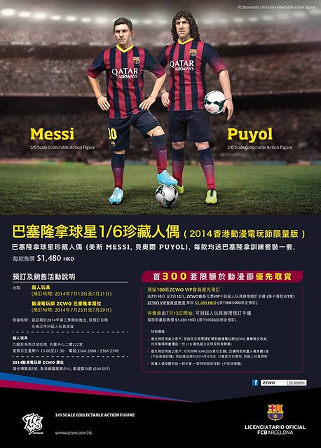 ZCWO 公司(ZCWorld)將要在今年2014 年的香港動漫電玩節(ACGHK)推出兩款巴塞隆納足球俱樂部(Futbol Club Barcelona;巴塞)的球星人偶作品:利昂內爾.梅西(Lionel Messi)與卡萊斯。普約爾(Carles Puyol)。一個是來自阿根廷強到炸掉的瘋狂得分機器,一個是來自西班牙鞏固後場的防守大將。喜愛與支持巴塞的球迷與玩具人怎麼可以錯過這經典的人偶作品呢?!目前會場會搶先發售300 套的限定版,有附送1/6 比例巴塞隆納訓練衣一套。相關詳細訊息,有興趣的玩具人可以參考ZCWO Facebook。