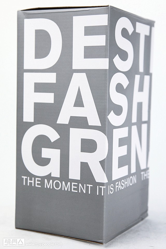 包裝盒採用灰色為底色,搭配著白色的字體,散發出一種帥氣的時尚感。大的字體是:DESTROY FASHION GRENADE。小的字體是:THE MOMENT IT IS FASHION。似乎宣告著,threeA 公司即將要在時尚產業投下一顆超大號的震撼彈一番。