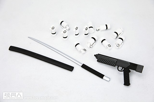 ▼ 白色普通版的STAR WARRIOR TK 所附的配件。值得一提的是這次所附的武士刀的刀面是純銀色的喔!完全表現出科技感。