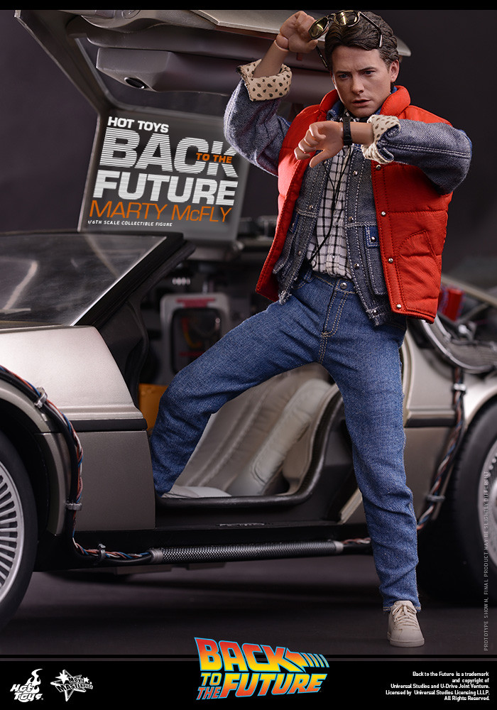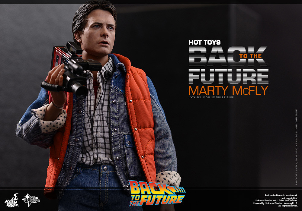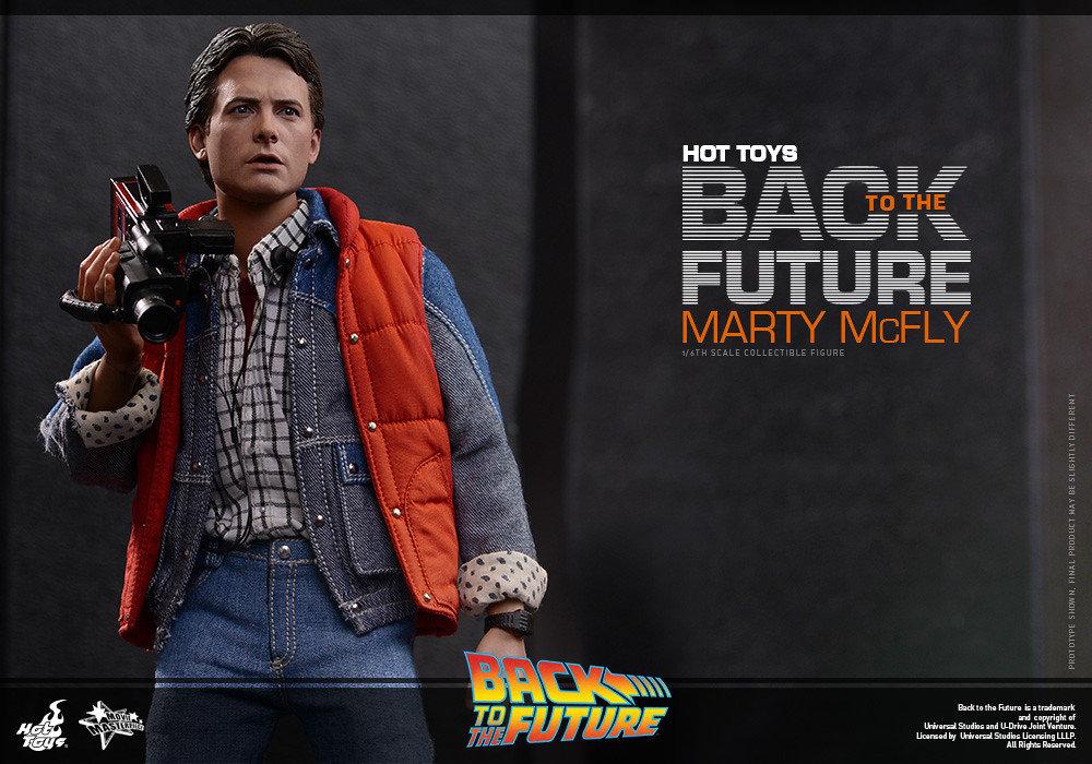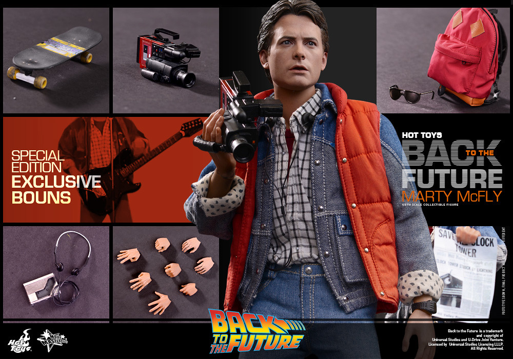 這次Hot Toys 公司所發行的1/6 比例「馬帝」,是經典的牛仔套裝 + 橘色招牌羽絨背心的造型。並且附上許多經典的配件。包括了他的背包、滑板、隨身聽以及錄影機等等,而限定版的配件是超帥氣的吉他!配件豐富的程度真的超乎你我的想像啊!此外,在官圖中也有透露出應該之後會發行1/6 比例時光車的可能性。傑克,這真的是太神奇啦!