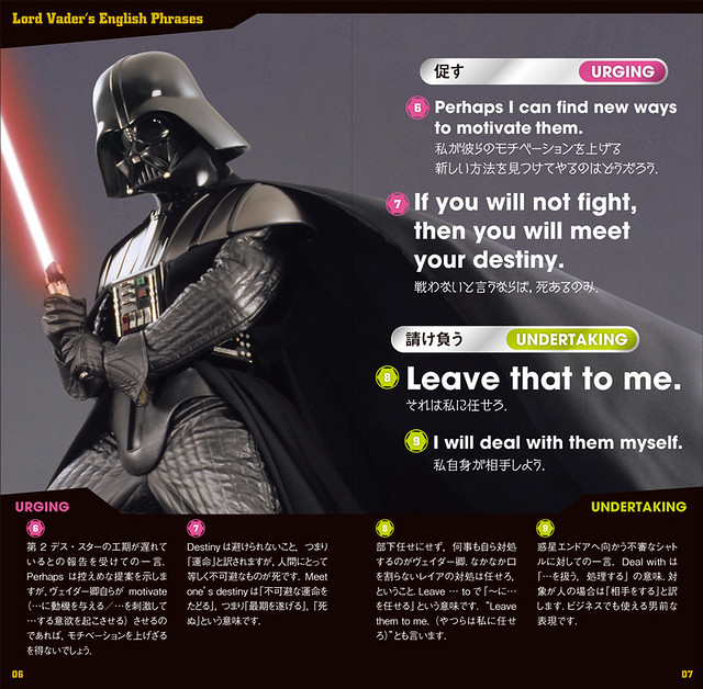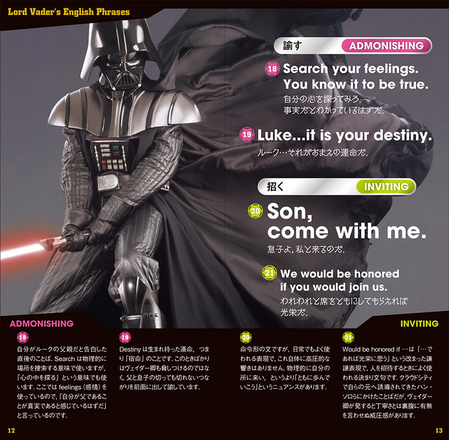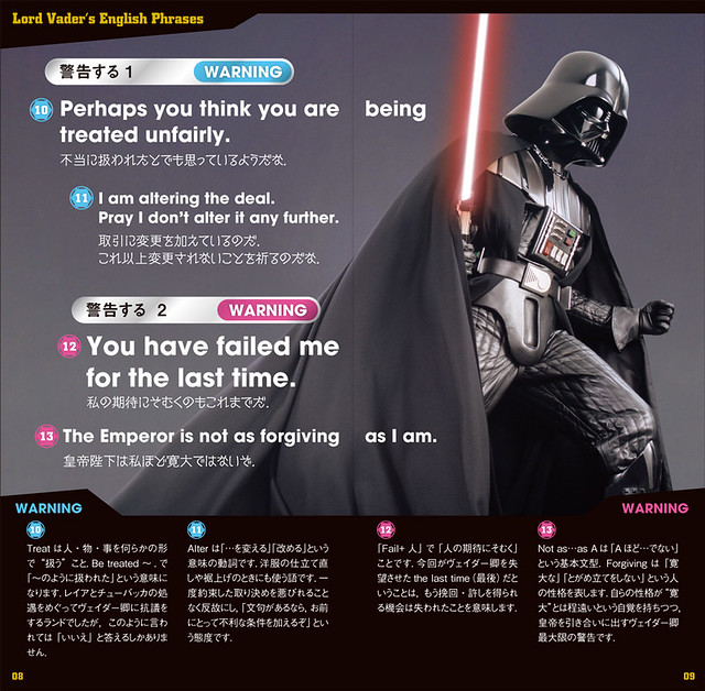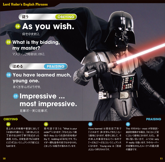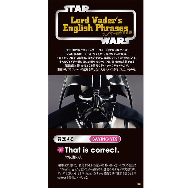 除此之外,本書開頭還收錄了「維德大帝的英語會話」(一共16頁),使用電影中黑武士的台詞,來解釋、說明各種應與文法的運用,其中大人氣的當然就是黑武士“充滿威嚴”的文法啦!~