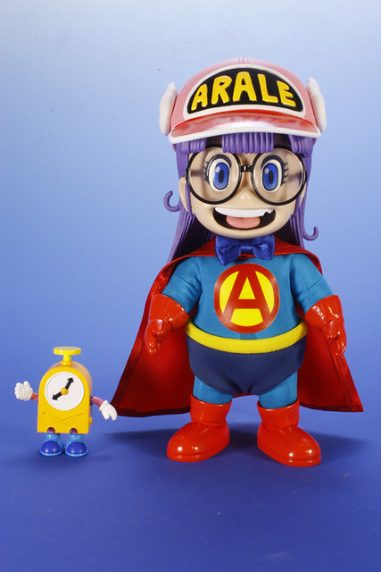 這次的作品將阿拉蕾的造型換成了惡搞性十足的超人裝,胸口的英文“S”換成阿拉蕾(ARALE)的“A”,披風內置了鐵絲可自由調整飄逸的模樣,並有三種不同造型的手部零件可自由變化姿態;除此之外,還附有一張全新的臉部造型零件,吐舌的頑皮模樣相當逗趣!~ 以及一款全新的時鐘角色“時間君”來搭配。特殊性十足的造型絕對值得擁有!各位《怪博士與機器娃娃》一定要珍藏如此別緻的款式~ 推薦給各位!