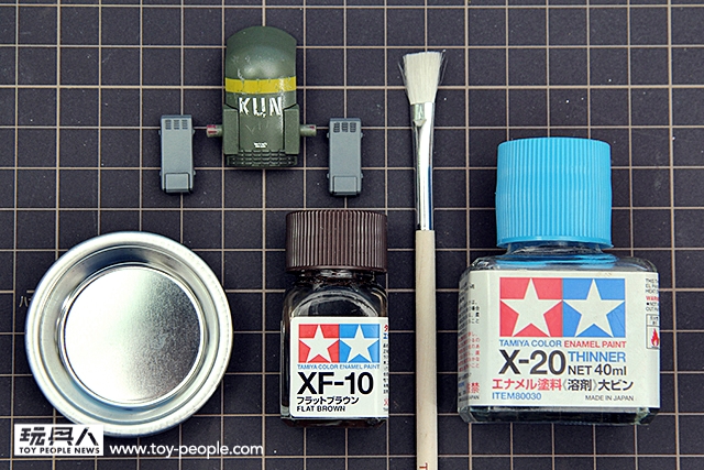 各位眼尖的玩具人,一定已經注意到了。原本零件上有兩個防爆夾的小零件,我們已經拆下來囉!因為用來洗色的漆料,已經加了很高比例的溶劑。溶劑本身很容易造成塑膠的劣化。所以要盡可能的減少塑膠零件跟溶劑的接觸,而我們要進行洗色的零件,是因為本身還有硝基漆膜甚至補土的保護,可以做些阻隔。所以大面積的漬洗影響較小。但對於沒有漆膜保護的套件就要小心的使用。這點請大家務必要注意,不然就真的悲劇囉!~