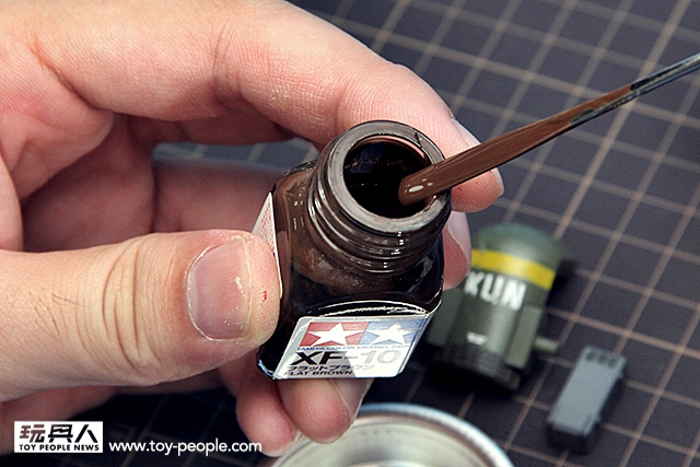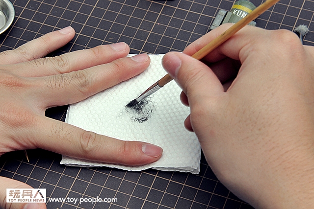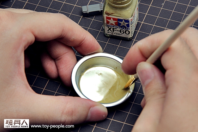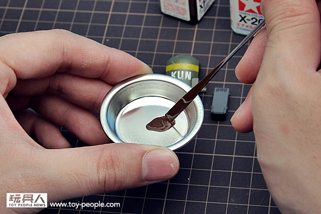 ▼ 攪拌好後,就可以把顏料放置於塗料皿中,攪拌好的漆料,是會自動的流下來的。洗色又叫作洗漬,如字面上的意義就是洗出汙漬感,這是洗色的一種呈現方式,其它也包含了陰影的呈現,或是立體感的強化。而我們現在操作的目的就是要洗出略帶汙漬的質感,所以接下來就會用洗漬來表達。