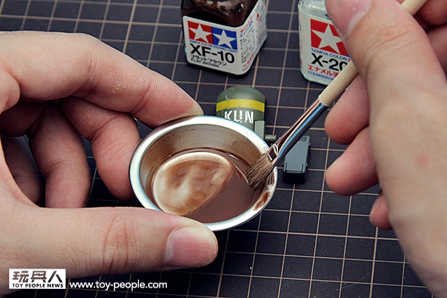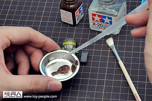 ▼ 要進行洗漬,直接使用原漆會太濃。所以我們要進行稀釋的程序,利用滴管,吸取琺瑯漆的溶劑(例如田宮的琺瑯漆,它的溶劑就是X-20)。比例大概是1:5(漆料1,溶劑5)。