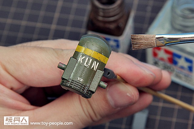 ▼ 這時候我們就可以用小筆進行洗色。因為是第二層的洗色,只要薄塗就好了,太重或是太濕會把第一階段的鏽感抹去。另外沙黃色跟機體改過的色有較為明顯的差異,所以要適量的使用。太多跟太重就會不自然囉。