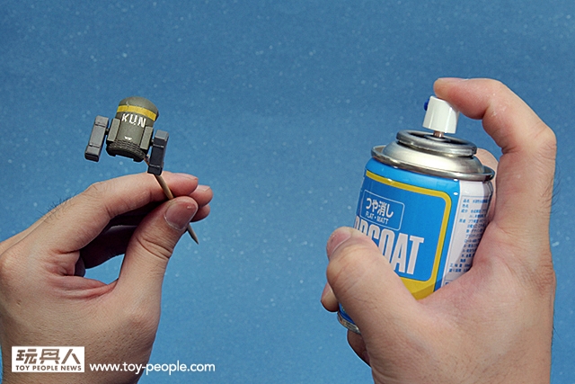 ▼ 接著就是拿出水性的消光保護漆“薄噴”在零件上。可別噴的溼答答的,太濕,會造成保護漆太厚,連續技就會中斷囉。而噴過消光保護漆,才不會讓鏽色的洗漬在後續的操作中消失。