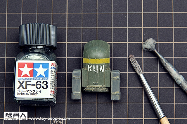 ▼ 洗色結束後,你以為招式就結束了嗎?還~沒~有!!!我們還要來乾掃一下。這次使用的是XF-63的德軍灰。使用德軍灰會呈現出現歷時較久的金屬傷痕。而之前使用的平光鋁色,比較像是剛出現沒多久的金屬傷痕。