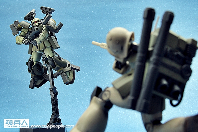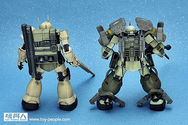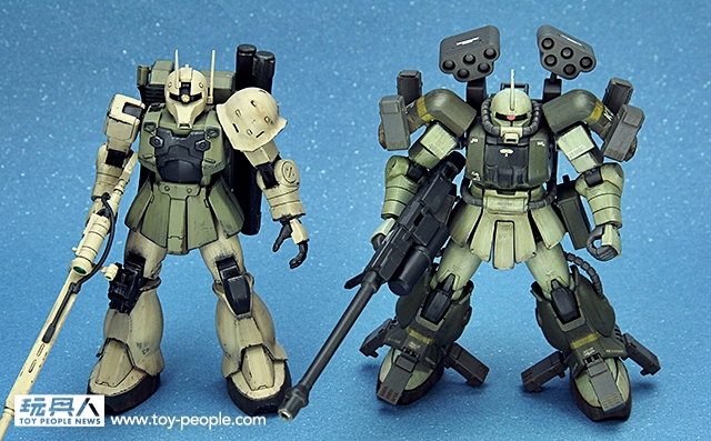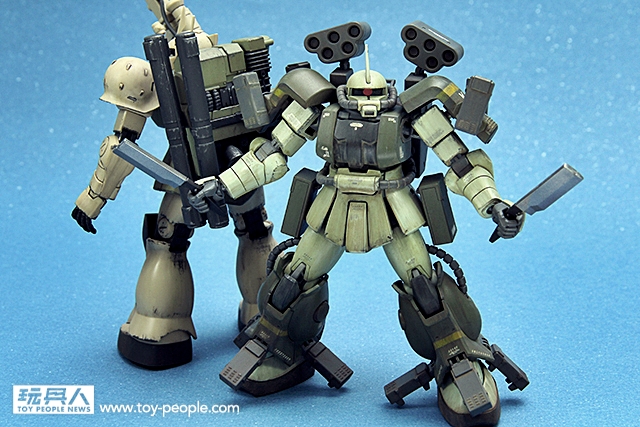 ▼ 最後讓它跟在《鋼普拉教室 Vol.5》擔任主角的薩克I 狙擊型進行比較,兩種不同程序的舊化戰損塗裝,你比較喜歡哪一種呢?