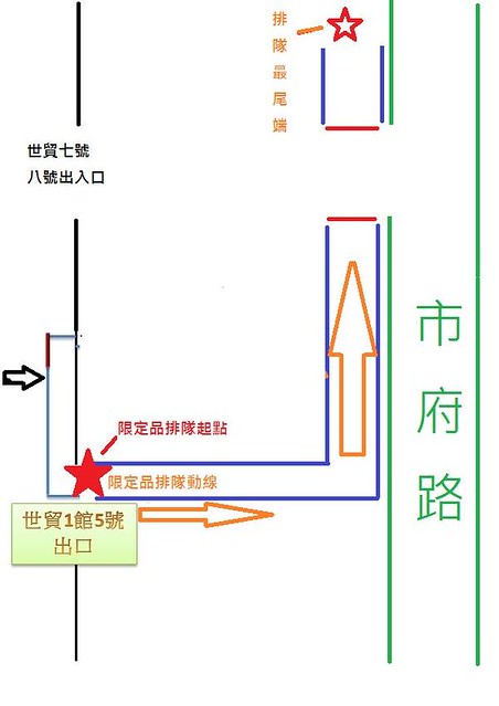 排隊動線:當日上午10點開放進場後,請沿著如圖1 的世貿一館五號出口處的【排隊入口】處開始進行排隊,排隊動線請參照圖2 動線,沿著市府路往7、8號出入口方向進行排隊。現場會有人員最尾端指示立牌,動線整隊後方開始發放購買單。若無持有購買單將無法購買限定品。