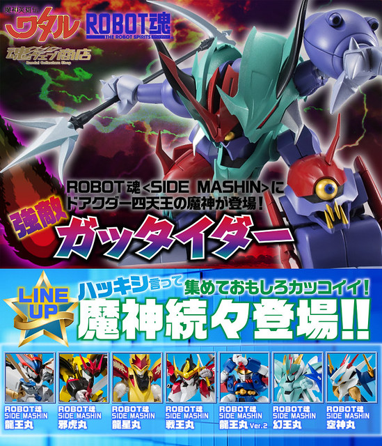 日Bandai萬代玩具公司的ROBOT魂系列預計2015年1月發行ROBOT魂〈SIDE MASHIN〉ガッタイダー 魔神Gattaider 亞泰德(暫時翻譯),動畫魔神英雄傳當中敵對魔神Gattaider以ROBOT魂可動系列呈現,可以將腳部份拆卸和組合變型,合併後高度約15公分,ROBOT魂 魔神Gattaider 附有交換用手首左右各2種、W-9スピア一式和魂STAGE用ジョイントパーツ等等配件,將於魂web線上商店8月7日起接受訂購,售價約10,260元日幣,提供給喜歡魔神英雄傳的玩具人參考。
