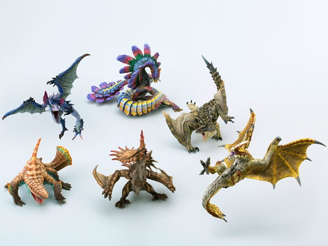 先前我們曾經為大家介紹過CFB的新魔物獵人模型系列「スタンダードモデル Plus 狂怒版」。近日又公開了正式名為第一彈的系列作品(那狂怒版算隱藏版嗎?XD)。收錄了6款預定在魔物獵人4G裡登場的人氣魔物,包含了「一角龍」、「千刃龍」、「黑狼鳥」、「轟龍亞種」、「化け鮫亞種」及「絞蛇龍亞種」,每款高約10~15公分,售價約600日圓左右,預計12月中推出,提供給各位獵人參考唷!