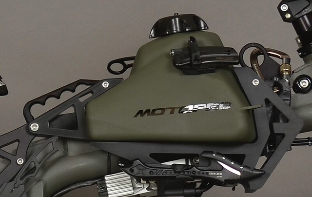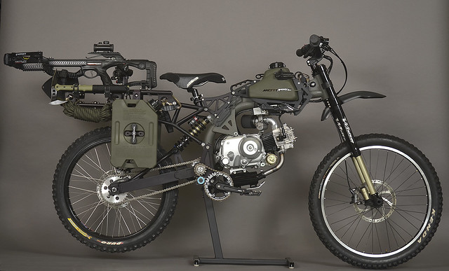 這一款名為“黑色行動特別版”(Black Opps Edition)的登山越野機車,是以“Motoped” 所推出的熱門車款“Rolling Chassis” 普通版所改裝。“Motoped” 的車款相當特殊,結合了登山腳踏車與機車的性能,平時是擁有極佳靈活度的越野機車,沒汽油的時候可以當作登山車!~ “黑色行動特別版”車身採用了硬派的軍綠 & 黑配色,並搭配三款殺殭神兵:十字弓、短撬與手斧,以及其它生存道具。兼具靈活性與隱密性,絕對是末日生存的最強載具!