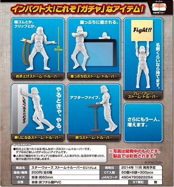 繼奇譚俱樂部的“杯緣子”系列、BANDAI 的“加油吧!修卡戰鬥員!~”系列取得巨大的成功之後,有越來越多的轉蛋品牌,開始陸續推出了兼具實用機能性的桌上實用玩具,而日本玩具廠商“TAKARA TOMY”的轉蛋事業部門“TAKARA TOMY ARTS”,宣布將推出以《星際大戰》的萬年雜魚“帝國暴風兵”(Stormtrooper/俗稱白兵)為主題的辦公小物轉蛋,名為“與白兵一起”(ストーム・トルーパーといっしょ)。