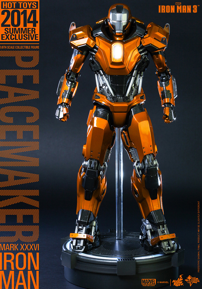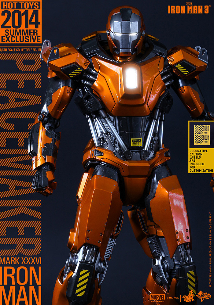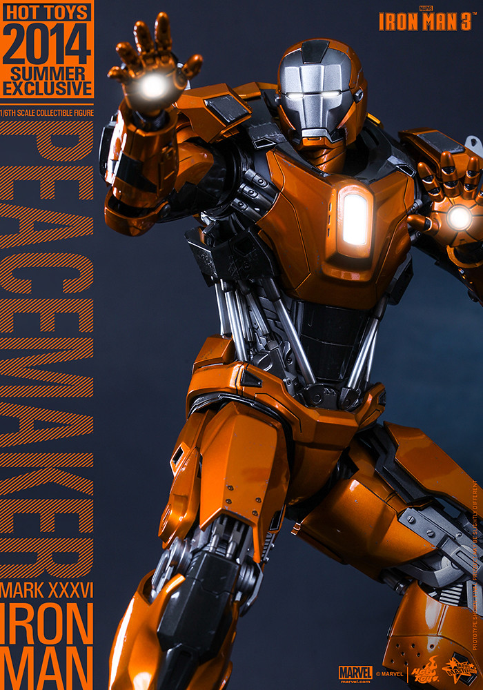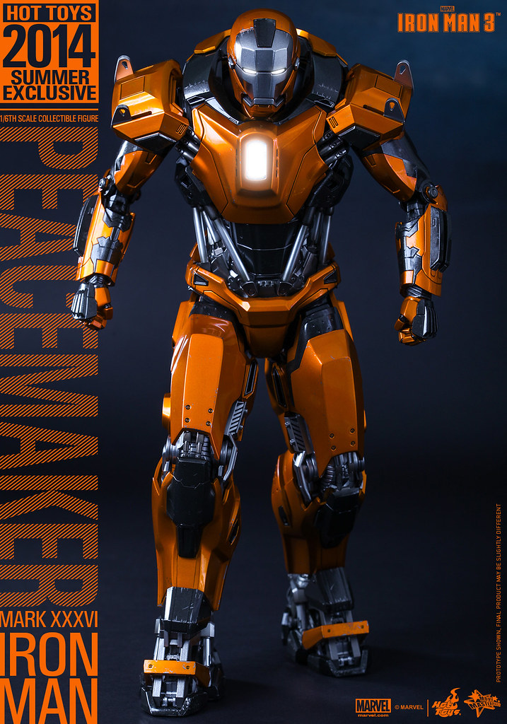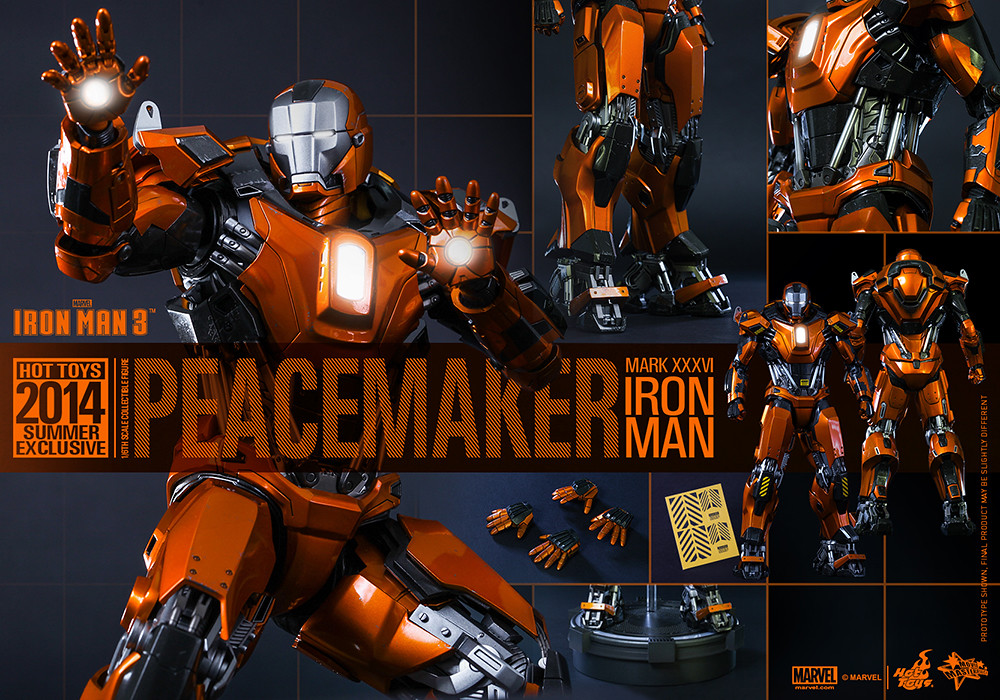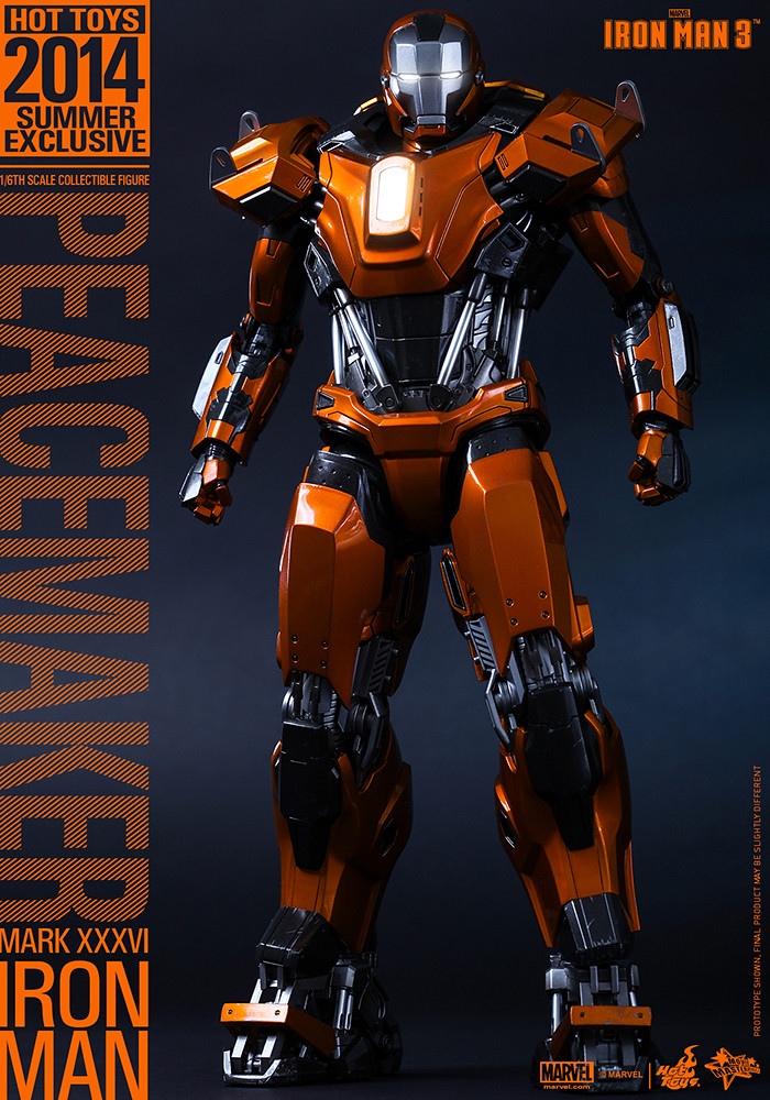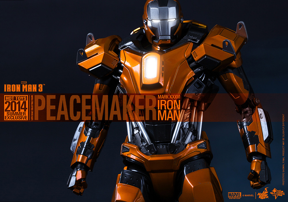 Hot Toys 公司的鋼鐵大軍又推出新作品了!繼馬克38 負重裝甲「伊格爾」推出之後,又一龐然大物作品馬克36 暴動鎮壓裝甲「和平製造者」(Mark XXXVI Peacemaker)。此款鋼鐵衣同樣是在電影「鋼鐵人3」中家庭狂歡派對協定(House Party Protocol)的戰鬥場景登場。