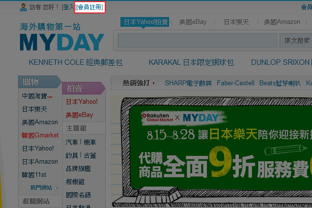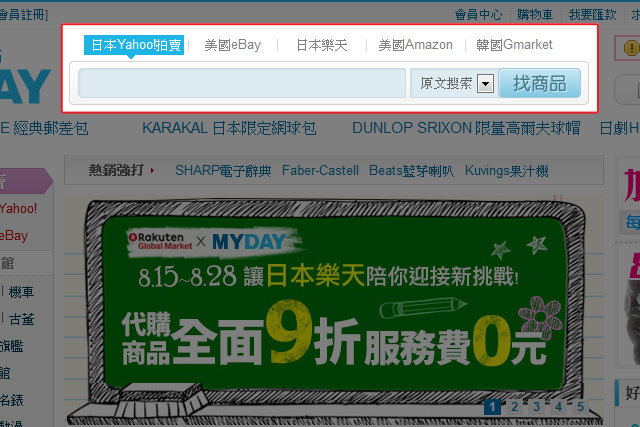 ▼ 「MYDAY 買對代標代購」網站有提供美國、日本、韓國總共五個不同的購物網站選項:日本Yahoo!、美國eBay、日本樂天、美國Amazon、韓國Gmarket。