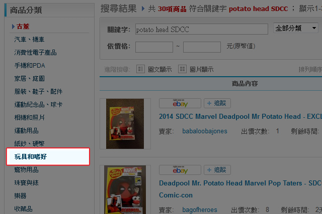 ▼ 各位玩具人可以在搜尋欄位你輸入所想尋找「商品關鍵字」,小編則是填上了「Potato Head SDCC」,並按下「找商品」的按鈕,網站就會馬上帶你去到「玩具商品選單」。