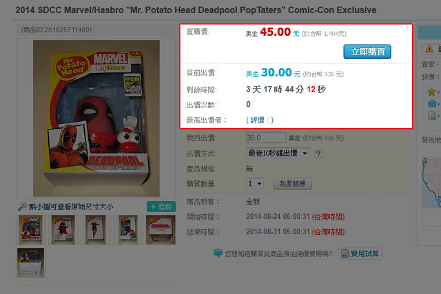 各位玩具人可以直接上「MYDAY 買對代標代購」的網站研究「海外競標」與「海外購物」的教學,或是可以跟隨玩具人小編的「註。挑。選。託。收」五步驟的海外競標購買教學。話不多說,立馬來跟玩具人小編來血拚一下玩具吧!看看小編是如何購買「聖地牙哥動漫展」(SDCC)會場限定的「死侍蛋頭先生」吧!