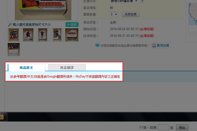 頁面所呈現的是「商品原文」,不過「MYDAY 買對代標代購」網站有提供連結到「Google 翻譯」的服務,可以將日、英、韓文通通都翻成中文。