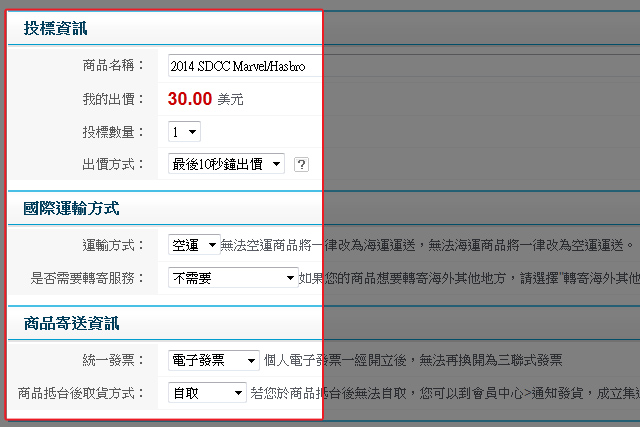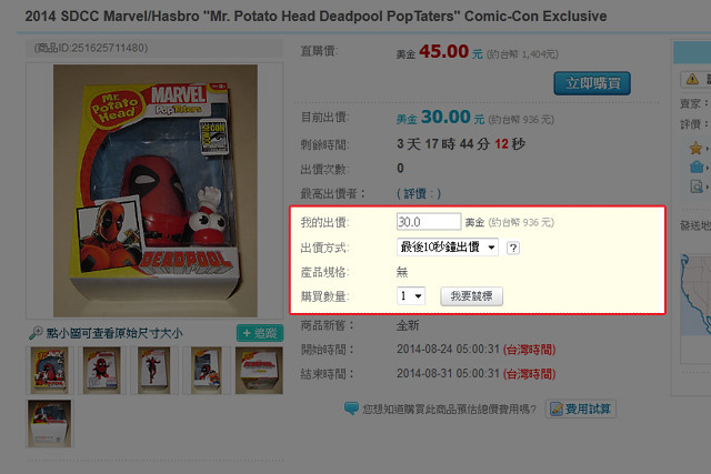 ▼ 在確認商品內容沒有問題之後,各位玩具人將「我的出價」與「購買數量」填寫完成後,就可請點選「我要競標」的按鈕。小編當然是小家子氣的從起標金額開始(誤~ 節儉是種美德~),輸入「美金30 元」,並選擇「最後10 秒鐘出價」。