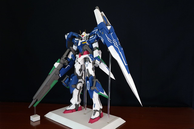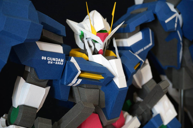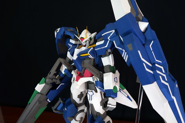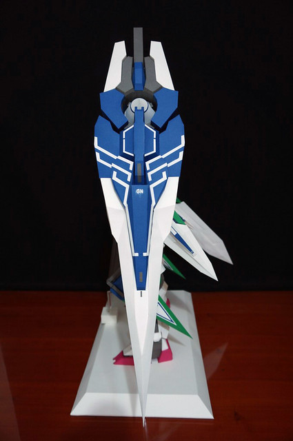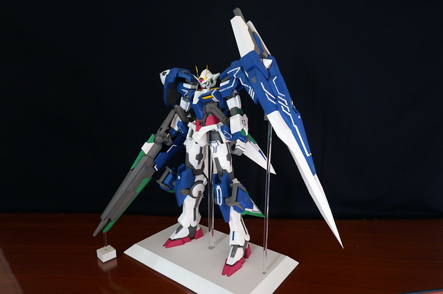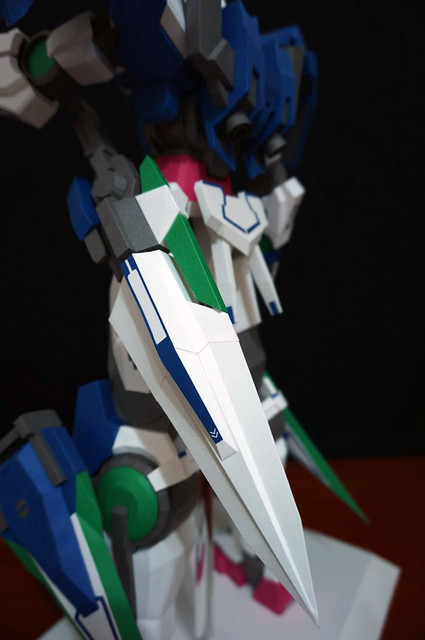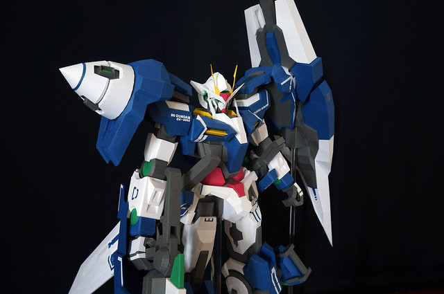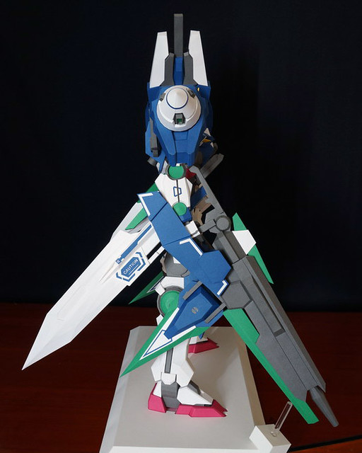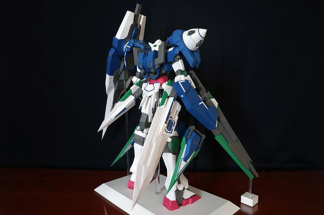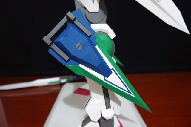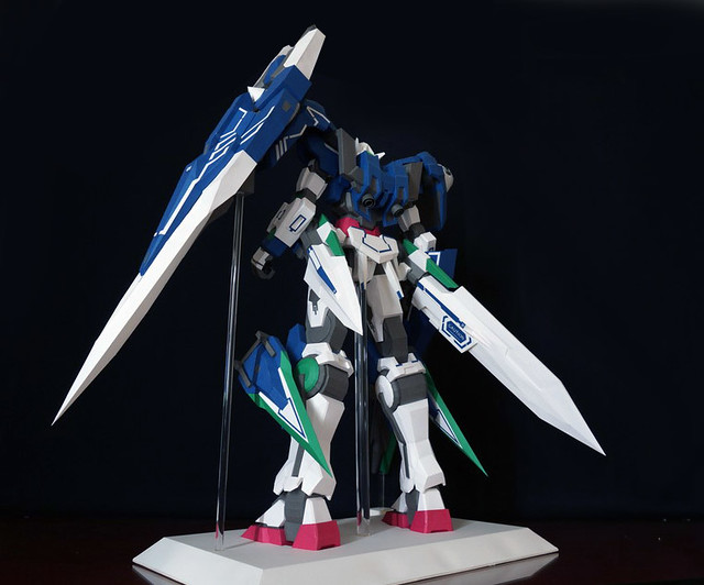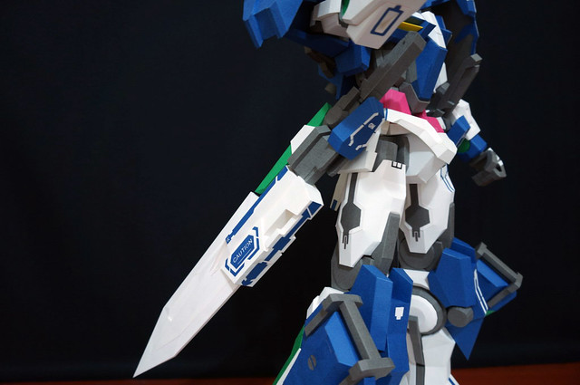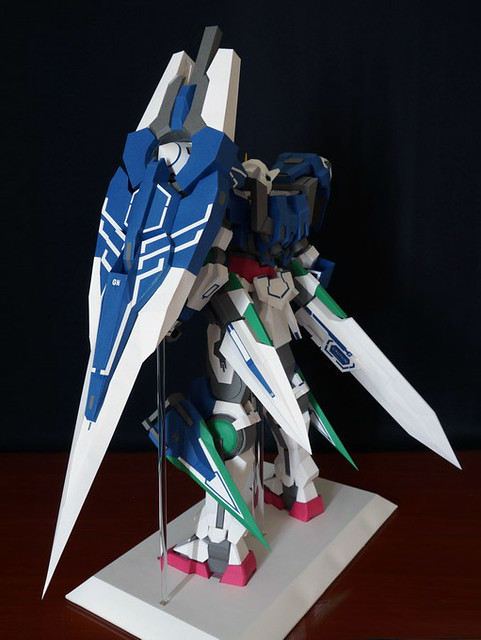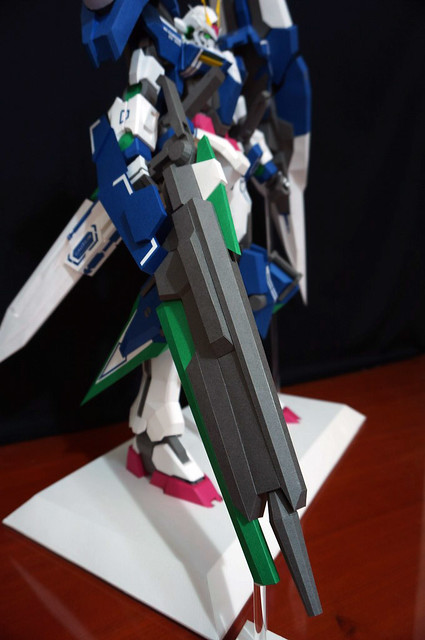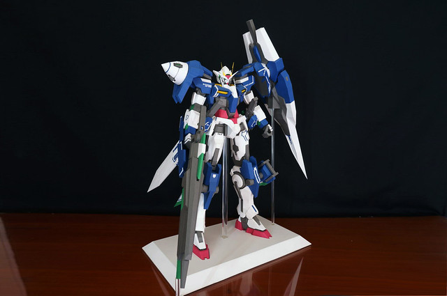 心得:這架鋼彈如果沒錯的話是位泰國的網友設計的,完成後原比例約為1:35左右,頭的部分我是使用浪仙版的00下去做的。武器部分使用磁鐵連接所以可拆下來,在下半身部分使用了珍珠板補強,即使只用了120磅的紙也是可以撐住整體,總結來說很不錯。