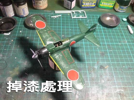 ↑ 開始進行掉漆的處理,由於先前已經噴上髮膠,之後用溫水或是各種不同的筆或牙籤進行刮擦的動作,綠色的漆會因為刮擦的動作,而剝落,這樣掉漆的效果就出現了。