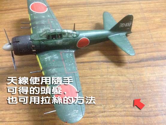 ↑ 這裡追加天線的做法,一般常見的是用廢框架拉絲,這裡則是用頭髮。用在1/72的飛機是剛剛好的。
