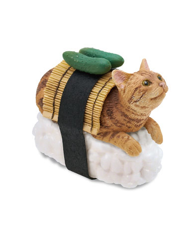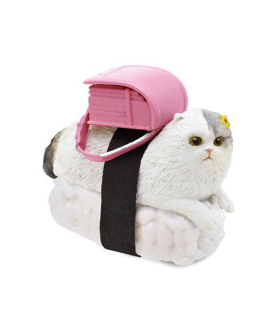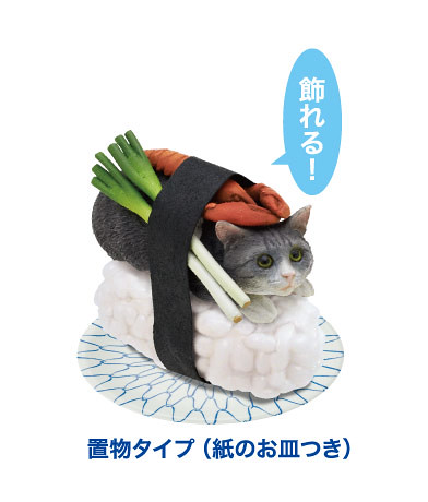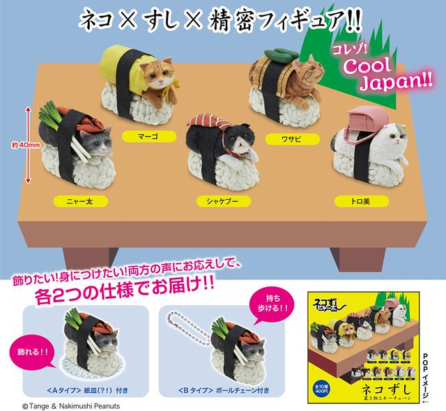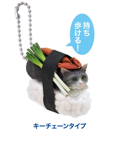 日玩具公司奇譚俱樂部預計2014年9月推出ネコずしニャー太 置物とキーチェーン 「貓壽司喵太」(ネコずしニャー太)立體鑰匙圈(裝飾品)轉蛋,將ニャー太、マーゴ、シャケブー、ワサビ和トロ美五隻可愛貓咪變成貓壽司立體化造型,尺寸大小約有4公分,單個轉蛋售價約400元日幣,喜歡貓咪的玩具人可以參考一下歐!