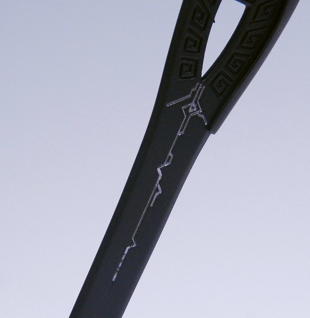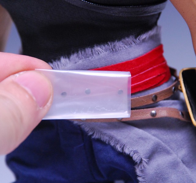劍鞘,這邊要說一下,劍鞘其實是利用兩個U型的零件去固定在皮戴上面,那個U型的零件受到外力拉扯很容易 掉,所以在裝的時候要小心一點,我的噴了出去差點找不回來,還好掉在貓咪的身上,加上貓咪又是白色的看起來特別明顯Orz,後來直接用牙籤沾點長春牌然後 點一下固定不然很怕又噴了XD
