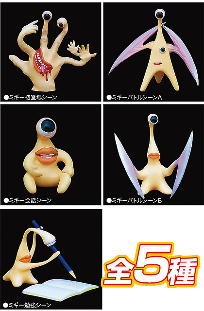 這次預計2014年10月推出寄生獣 リアルフィギュアコレクション<ミギー> 寄生獸米奇 實圖收藏 盒玩(暫時翻譯),約有五種不同型態的寄生獸 米奇可以提供收集,尺寸高度大約有4.8~8.5公分不等,單款售價約496元日幣,提供給喜歡漫畫寄生獸的玩具人參考。
