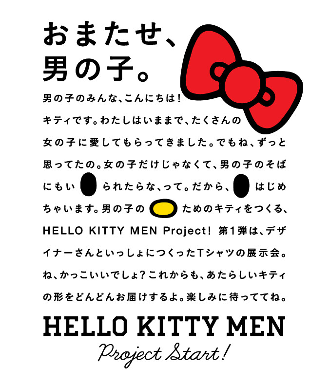 專為男性朋友所設計的HELLO KITTY MEN,是為了打破「KITTY是女生的玩意兒所以不想碰」這種既定印象,由sanrio 為了具備玩心、從容、幽默感特質的男性所設計,讓他們能將HELLO KITTY 穿得非常時尚的KITTY Tshirt。這就是「HELLO KITTY MEN」品牌誕生的由來。這次的專案,邀請到了日本知名的設計工作室nendo、活躍於平面設計與雜誌的田部井美奈,以及石黑篤史(OUWN)三組團體創作原創設計。