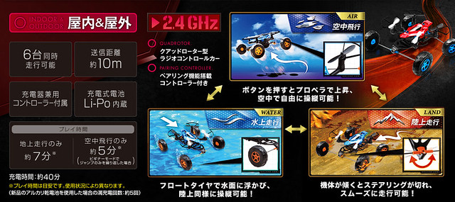 日本玩具廠商Takara Tomy,將推出能夠在空中、水上、陸地行走與飛行,完全不受地形限制的遙控車「水陸空RC」!