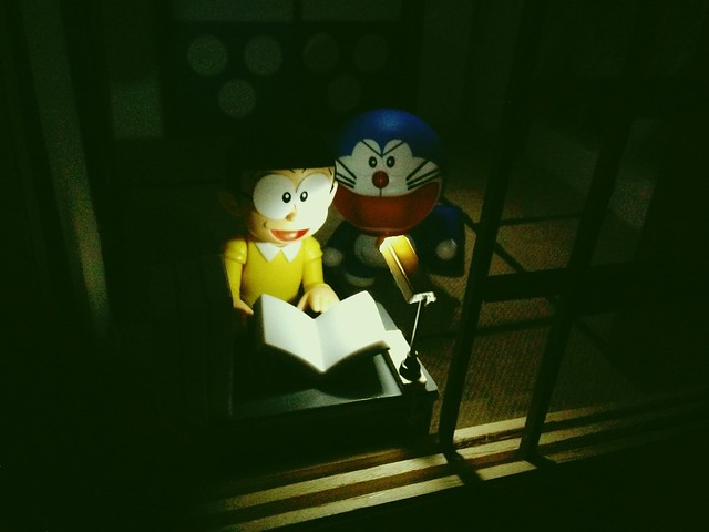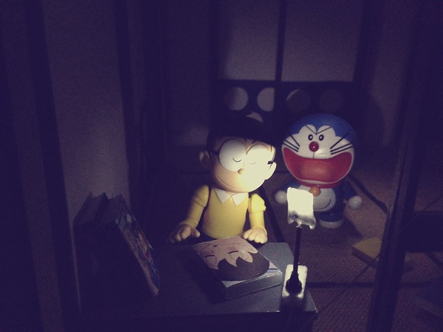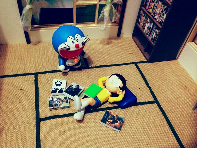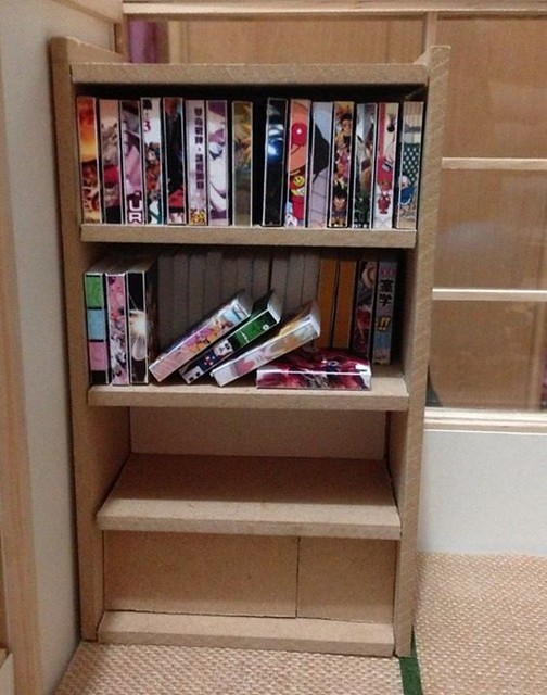 大雄的房間挺簡單的,書桌椅子和書櫃,買不到現成的只好自己動手做書櫃,拉門送輸出印刷時也順便印了書皮,第一次抓書的數量不夠多,需要再印多點了。