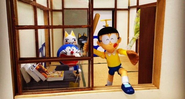 做活動式的好處,各個角度都能拍,連大雄裝竹蜻蜓從窗戶偷溜出去打球也行~