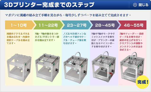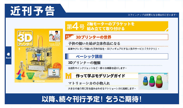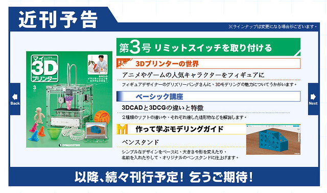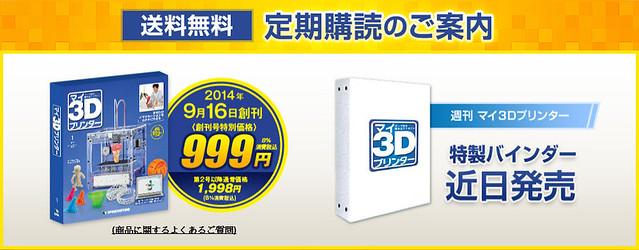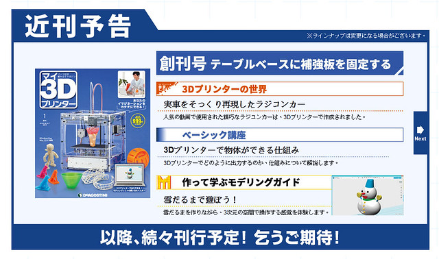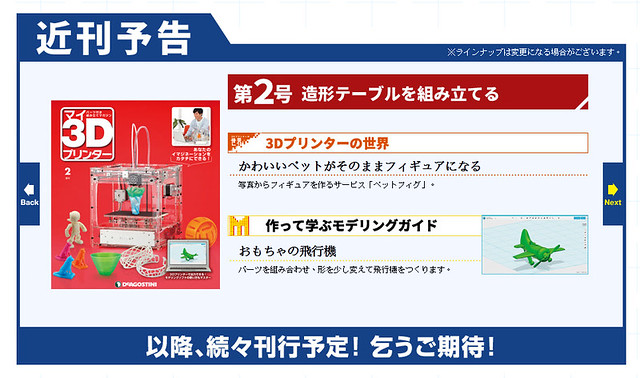 日本雜誌社「Deagostini」推出了特殊的收藏、組合週刊『週刊 我的3D印表機』(週刊 マイ3Dプリンター),每期附贈一款零件,全部集齊就能組裝出一台能夠自行列印立體造型的3D 印表機!