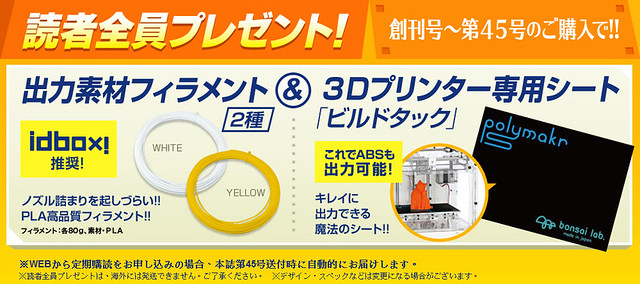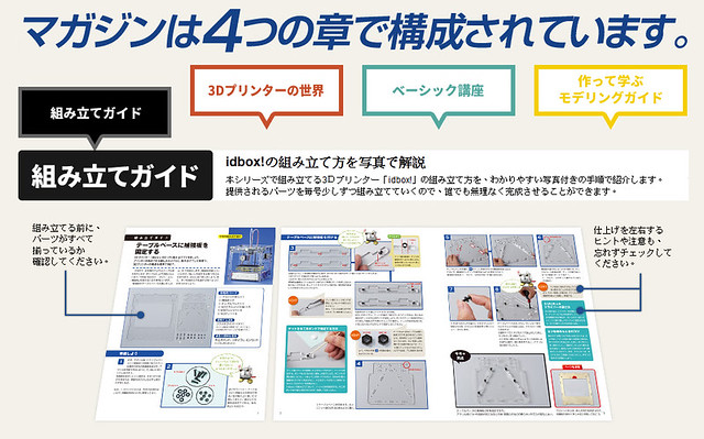 第一期推廣價格¥999,將附贈「基座補強固定版」(テーブルべースに補強版を固定する)。除此之外,雜誌的內容還將教導如何利用電腦製作3D 檔案、3D 建模的相關技術。3D 設計的部分將會附有範例檔案,可從最基礎的操作開始逐步學起,並逐漸理解更進階的技巧。除此之外,每一期都有網路教學影片,即便是初學者也能夠安心。而3D 設計的軟體可免費下載,從第2期開始每期售價¥1998。