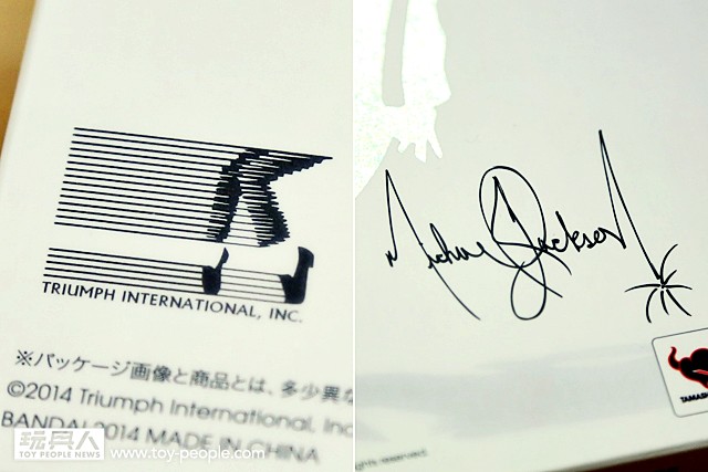 ▼ 除此之外,我們能夠在下方看到麥可‧傑克森的簽名、以及官方授權公司“Triumph international, inc”的LOGO。這個招牌LOGO 首度出現於MJ 1988年的電影《Moonwalker》片頭,穿著Billie Jean 舞台表演時的知名造型,搭配著MJ 的步伐與閃光效果,並以極具識別度的舞姿作為圖像。