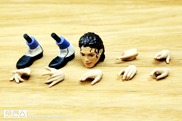 ▼ 替換用的手部零件包含了許多不同的手勢變化,可重現MJ 許多經典舞步時獨特的手勢。除此之外,還附有一顆微笑造型的頭雕,也能夠為人偶帶來不同的造型效果。另外附上的腳步零件,可說是重現「無重力傾斜」的重要關鍵!