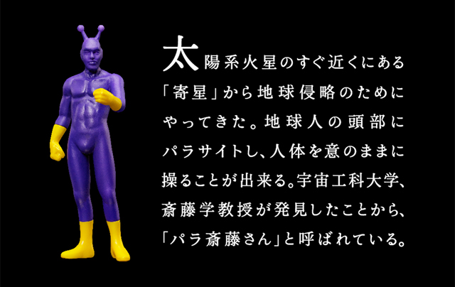 『寄生齊藤』是從火星附近的『寄星』前來侵略的寄生型外星人,會寄生於人類的大腦中操縱其行為。由於被宇宙工科大學的齊藤學教授發現,而命名為『寄生齊藤』。其實,『寄生齊藤』的日文原名為“パラ斎藤さん”(PALA SAITO san),與“寄生蟲”的英文「Parasites」為諧音。