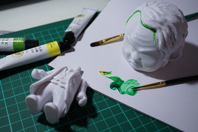 先塗好需要的底色頭髮再來才繼續塗陰影與漸層,嘴巴與眼影部分因為壓克力顏料很難表現,吉米是使用水性粉彩筆先塗抹在使用筆沾水塗暈開方式上色!