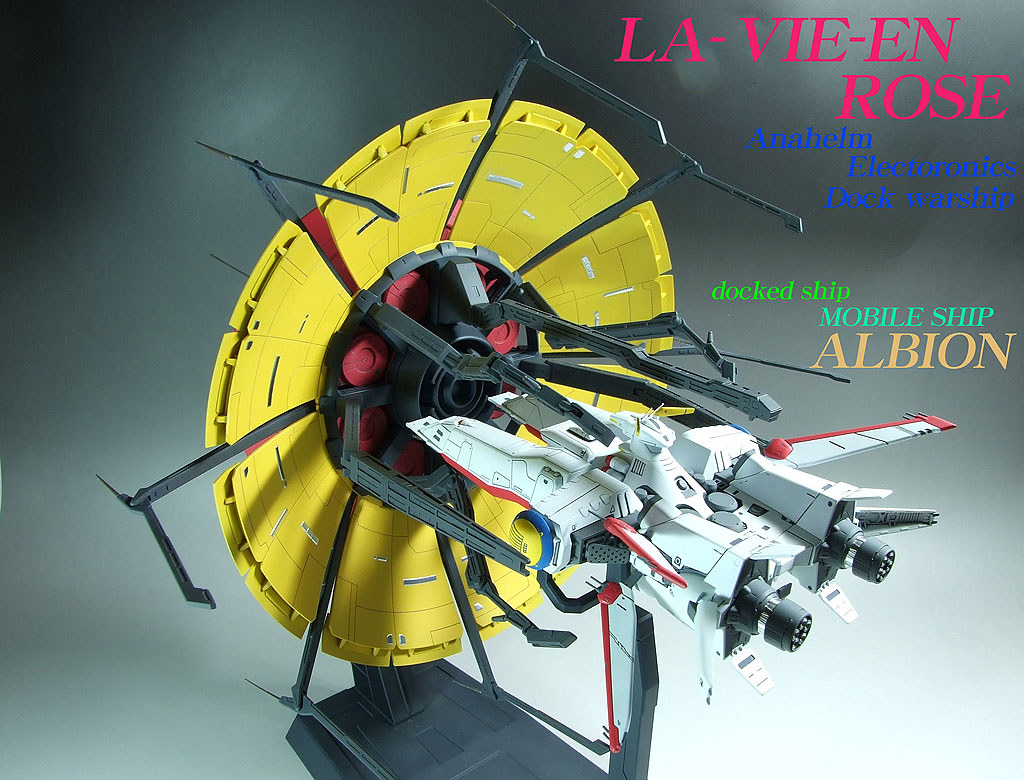 ▼ 2006 年9 月推出的1/1700 玫瑰人生號宇宙船塢,可以讓同比例的阿卡馬或亞爾比翁號停泊其中,在冰冷的宇宙中找到一處安心的避風港。盒中還附了昆曼沙、GP03D 鋼彈、還有各4 架的海兵吉爾古格和吉姆特裝型。