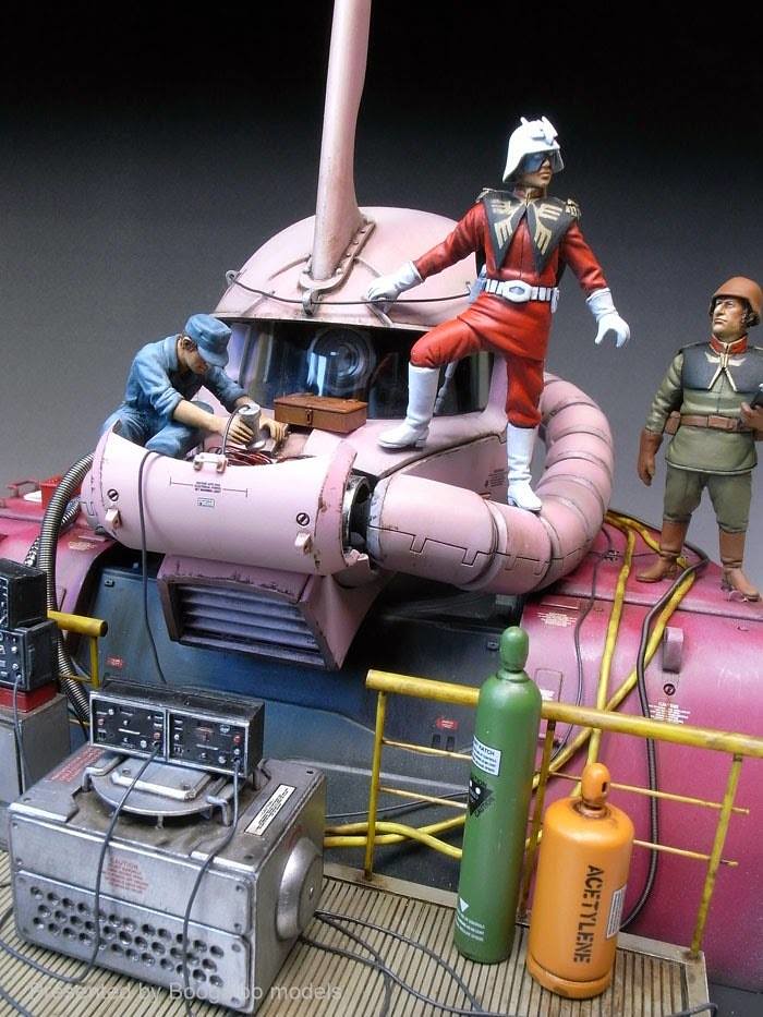 ▼ 活用了「吉翁軍藍巴拉爾獨立遊擊隊」套組中薩克的頭部套件,打造出紅色慧星夏亞出擊前的整備場景,夏亞是作者用造型補土自製的,但,看起來是不是有幾分發福啊?