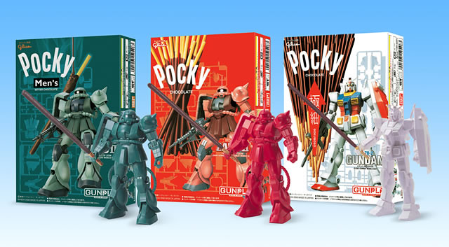 ▼ 2006 年,鋼彈和pocky 巧克力棒聯名,推出了內附FG 鋼普拉的限定版,一共推出鋼彈、紅薩克、綠薩克三種包裝,最好玩的方式,當然就是彼此拿著巧克力棒當成光劍互砍囉。