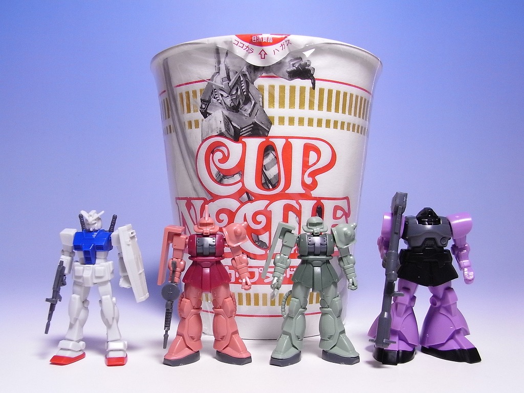 2009 年8 月,日清食品和鋼普拉攜手合作,推出了買鋼彈送泡麵,呃,不對,是買泡麵送鋼彈,呃,好像也不對。總之是鋼中有麵,麵中有鋼,鋼普拉和泡麵包裝在一起販售的鋼普拉泡麵。當然,鋼普拉是不能吃的,趁著沖泡三分鐘的空檔,剛好來組一下鋼彈吧。