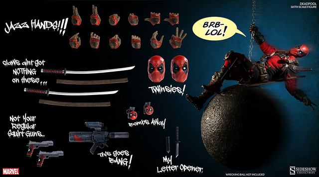 這一款作品展現了Sideshow 多年來累積的製作技術,忠實地呈現了「死侍」在原作中的經典造型;除此之外,為了能夠對抗Hot Toys 作品而大幅提昇的高端收藏級水準,而製作了更加細緻、內容豐富的配件與服飾,並且附屬了大量特殊設計,能夠替換內容的漫畫泡泡框,用以呈現這個瘋癲、囉唆的煩人角色特質。