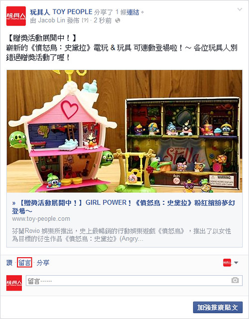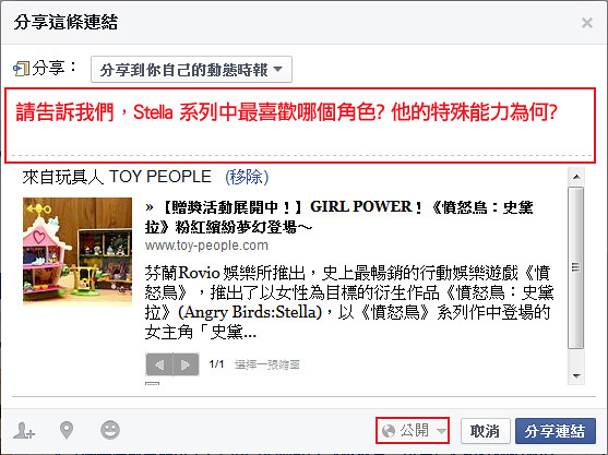 1. 到本次的「GIRL POWER!《憤怒鳥:史黛拉》粉紅繽紛夢幻登場~」報導按“讚”,並分享至你的塗鴉牆上,分享時寫下你覺得“Stella 系列中最喜歡哪個角色? 他的特殊能力為何?”
